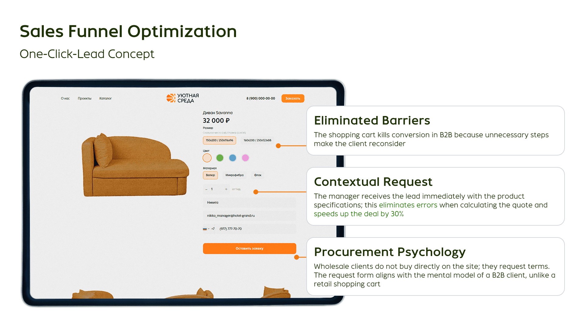Instead of a purchase button, we created a contextual request. The manager receives a lead immediately with the product specification. This speeds up deal closure by 30% and eliminates human error in calculations.