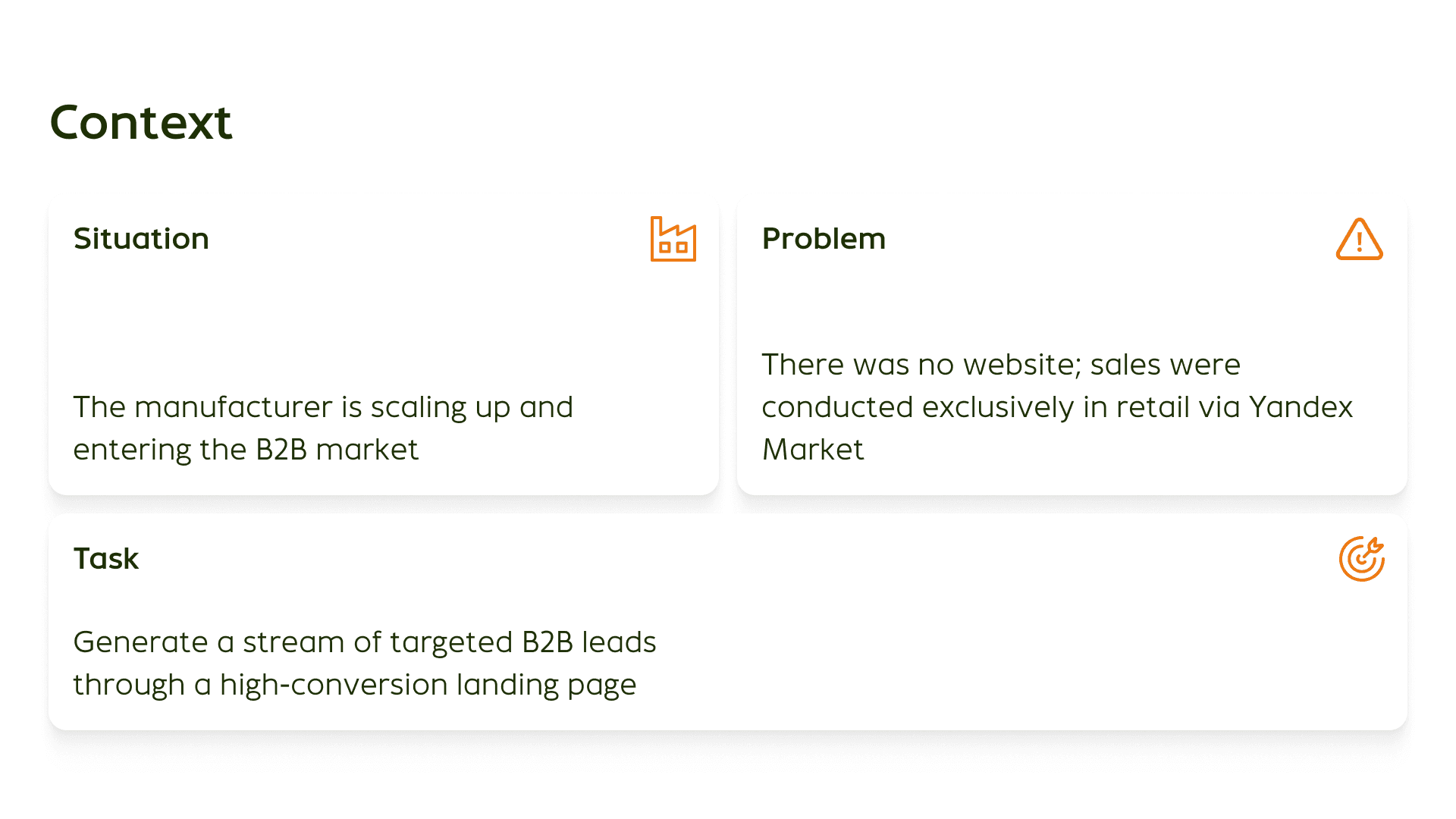 Problem: no website, no reputation in the professional field, sales only through marketplaces.