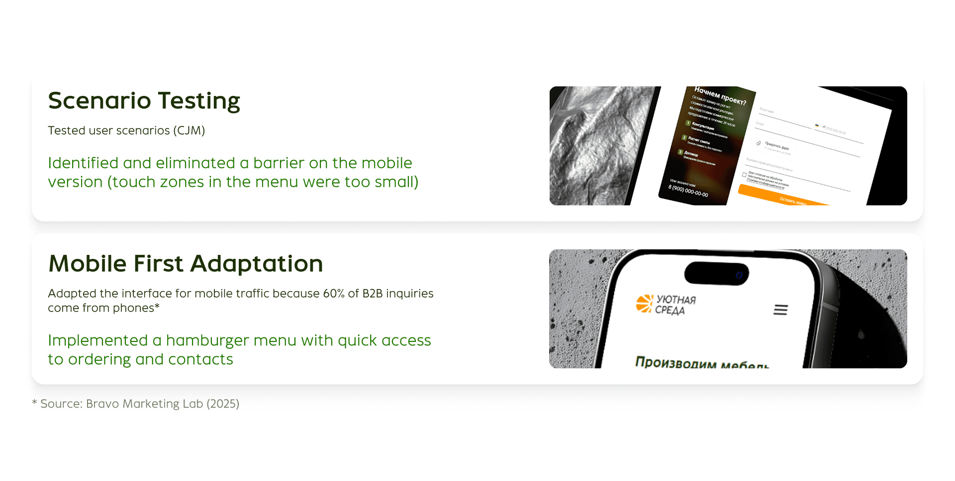 We developed a mobile-first design with usability as the priority: larger touch zones and instant access to contacts via the burger menu.